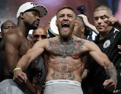 2017 AP YEAR END PHOTOS - Conor McGregor, center, stands next to Floyd Mayweather Jr., center left, during their weigh-in on Aug. 25, 2017, the day before their boxing match in Las Vegas. (AP Photo/John Locher)